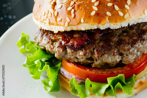hamburger close-up with beef, tomato, lettuce, cheese and onion on table. Fast food on dark background