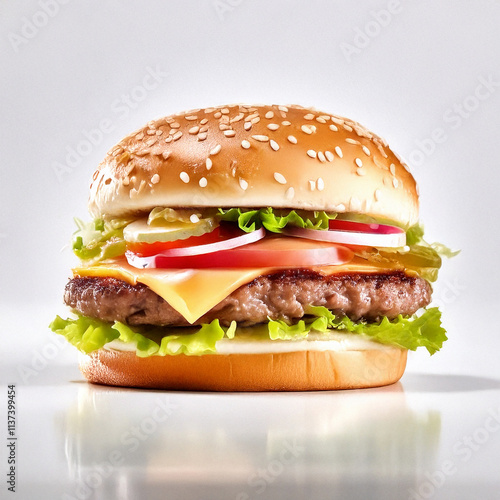hamburger on a white background, front view of burger on clear white studio background