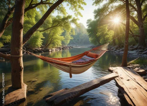 Hammock hanging from a wooden beam over a tranquil river, nature, serene