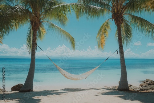 Hammock Swaying Gently Between Palm Trees by the Tranquil Sea During Clear Sunny Weather. Generative AI