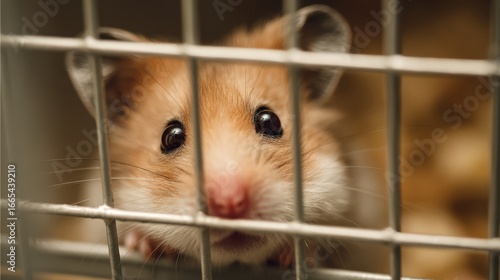 Hamster hopeful eyes gazing through shelter cage bars with adoption sign visible