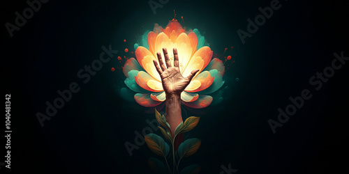 Hand & Fingers Reaching out of a Blooming Flower Pedal, Colorful Surreal Abstract Background Graphic