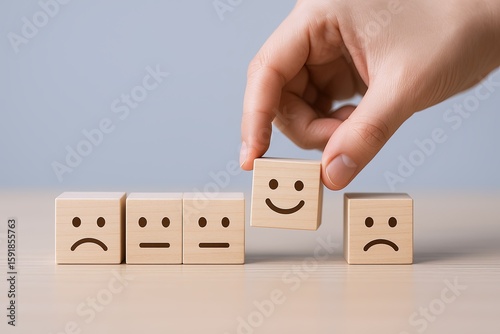 Hand adjusting wooden block with happy face among sad face blocks on a neutral background.