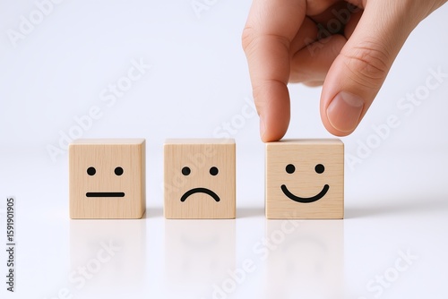 Hand adjusting wooden block with smiley face among two blocks with sad and neutral expressions on plain white background.