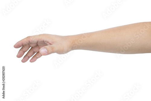 Hand and arm asian man or caucasian hand gestures hold or catching something empty or Hand signal isolated on white background