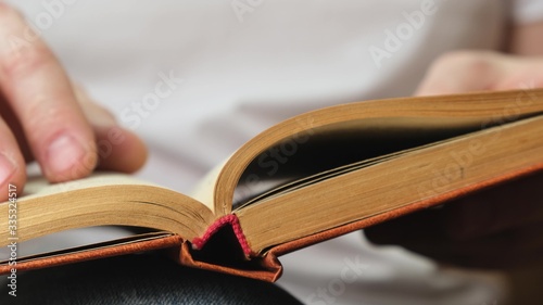Hand and book: reading a book and holding your fingers along the lines. Close up.