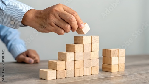 Hand arranging wood block stacking as step stair on wooden table. Business concept for growth success process. Copy space
