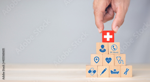Hand arranging wood block stacking with icon healthcare medical, Health insurance - concept.
