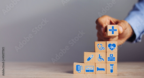 Hand arranging wood block stacking with icon healthcare medical, Insurance for your health medical, Insurance for your health concept.