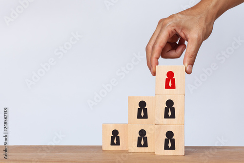 Hand arranging wooden cube stack as a pyramid on white background. Concept of human resources management and recruitment business