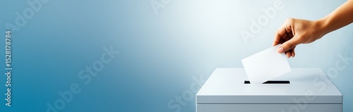 Hand casting vote into ballot box on blue background with blank copy space for election, voting, democracy, or political campaign concept. Ai generative.