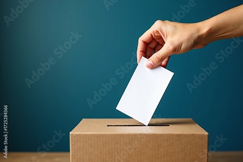 Hand casting vote with ballot paper in cardboard box against blue background, representing democratic election process