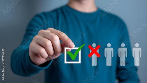 Hand choosing a candidate, selecting a person with a check mark icon, while discarding others with a red x, showing a modern recruitment process for job seekers.