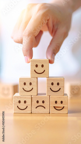 Hand choosing smile face from Emotion block for customer review, good experience, positive feedback, satisfaction, survey, evaluation, assessment, mood, world mental health day concept