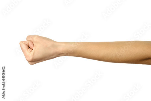 Hand clenched in a fist. Woman hand gesturing isolated on white