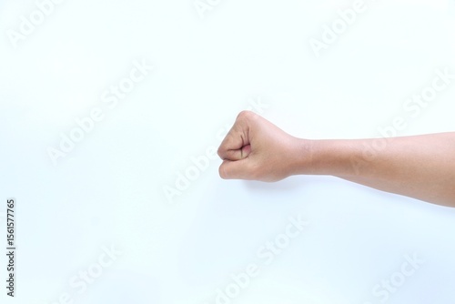 Hand clenched on white background. Clenching fist. Holding something