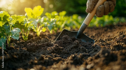 Hand digging soil with a shovel in a vibrant vegetable garden