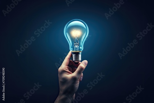 Hand displaying a glowing light bulb on a dark background, signifying thought.