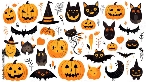 hand draw, 2d, Happy Halloween set of elements, ghost, pumpkin, bat and cat. Vector is cute illustration in hand drawn style isolated on white background. Decorative elements for website, book, postca