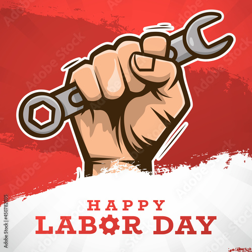hand draw labor day by holding a wrench and a red brush design background suitable for greeting cards, flyers, posters, banners, web or social media posts