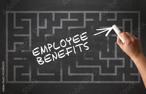 Hand drawing EMPLOYEE BENEFITS inscription with white chalk on blackboard, new business concept