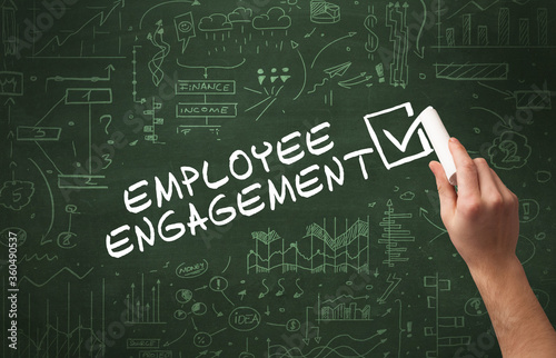 Hand drawing EMPLOYEE ENGAGEMENT inscription with white chalk on blackboard, new business concept