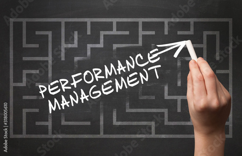 Hand drawing PERFORMANCE MANAGEMENT inscription with white chalk on blackboard, new business concept