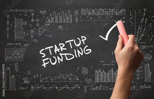 Hand drawing STARTUP FUNDING inscription with white chalk on blackboard, new business concept