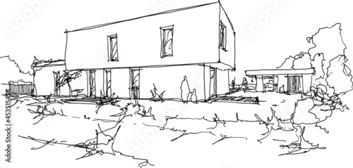 hand drawn architectural sketches of modern one story detached house with flat roof and people around