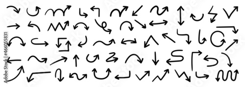 Hand drawn arrow black mark set. Isolated Hand-drawn arrows icons on white background. Different pointer collection. Simple drawing arrow pen. Vector illustration.