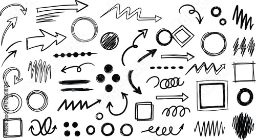 Hand Drawn Arrows Circles Squares with Doodle Lines on White Background