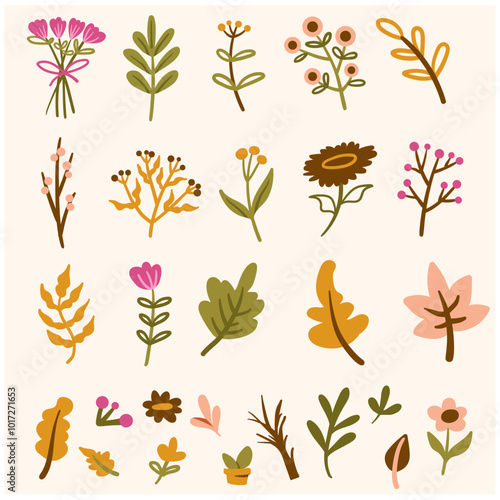 Hand drawn autumn leaves and flowers abstract With illustration style doodle and line art