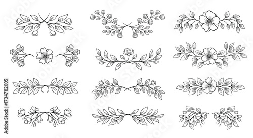 Hand Drawn Botanical Branches with Flowers and Leaves for Decorative Borders leaf floral