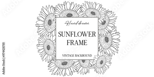 Hand drawn botanical frame with sunflowers. Vector illustration in sketch style isolated on white. Realistic sunflower design element. Space for text