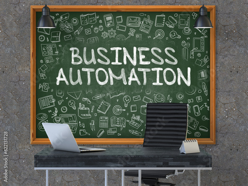 Hand Drawn Business Automation on Green Chalkboard. Modern Office Interior. Dark Old Concrete Wall Background. Business Concept with Doodle Style Elements. 3D.