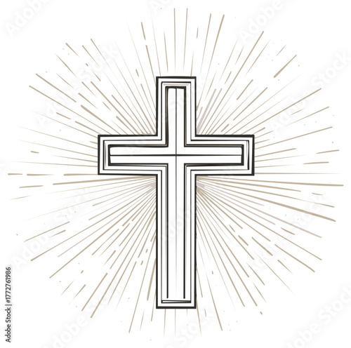 Hand drawn Christian cross with sunburst rays spiritual religious symbol