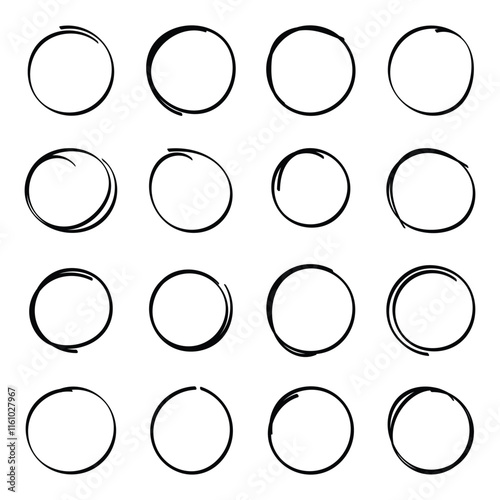 Hand drawn circles. Hand drawn circle frames set. Doodle circles. Rounds scribble line circles. Doodle circular logo design elements.