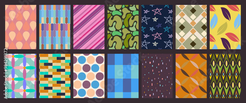 Hand drawn collection of simple funky geometrical patterns with cute elements. Groovy designs with retro vibes. Abstract colorful art for posters, flyers, cards, wallpapers, print.
