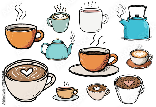 Hand Drawn Color Illustration Collection of Mugs Teapots and Coffee Cups. Ai Generated Images