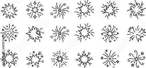 Hand Drawn Comic Firework and Starburst Icons. Decorative Explosion Doodle Set. Vector illustration