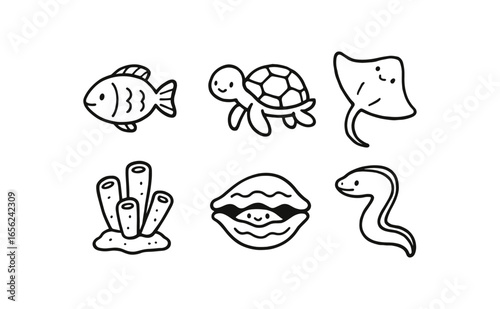 hand drawn cute doodle ink line art style line monochrome monochrome isolated on white background barrier reef flat (life): fish turtle ray sponge clam eel