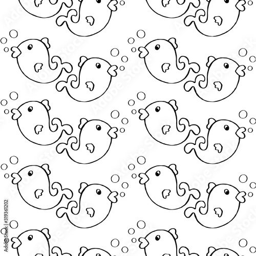 hand drawn Cute Fish with bubble. black and White Pattern. Cartoon Illustration