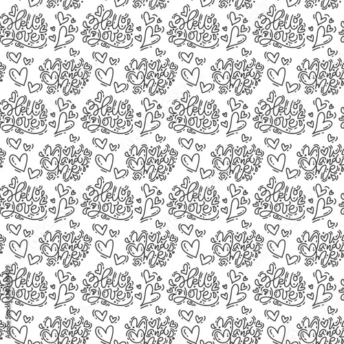 Hand drawn cute Valentines Day heart flourish and Hello love text pattern background. Seamless Vector illustration for love and wedding, greeting card and invitation