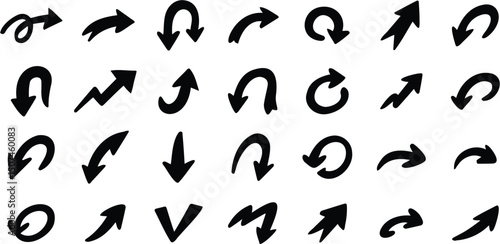Hand drawn directional arrow icon collection with sketchy curved, straight and looped arrow symbols in black