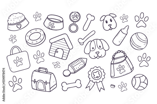 Hand Drawn Dog Accessories and Pet Supplies Doodle Set. Bowls, Bones, Toys, Grooming Items, Paw Prints, Treats, and Dog House Icons vector illustration.