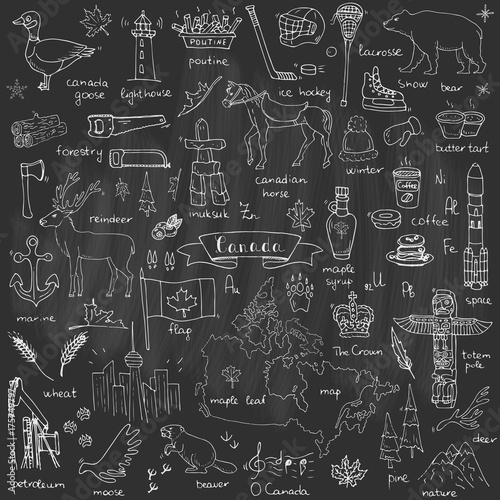Hand drawn doodle Canada icons set Vector illustration isolated symbols collection of canadian symbols Cartoon elements: bear, map, flag, maple, beaver, deer, goose, totem pole, horse, hockey, poutine