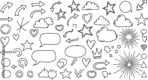 Hand Drawn Doodle Design Elements Black and White Collection Diverse Set of Arrows Hearts Stars