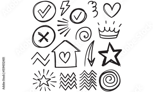 Hand Drawn Doodle Elements – Sketch Arrows, Hearts, Stars, Lightning, and Decorative Design Icons