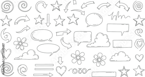 Hand Drawn Doodle Elements Arrows, Stars, Hearts, Clouds, Speech Bubbles Outlines