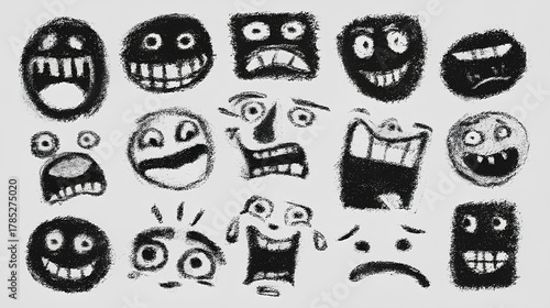 Hand drawn doodle emoticons set. Chalk or marker style faces with various expressions isolated on white Stock Vector